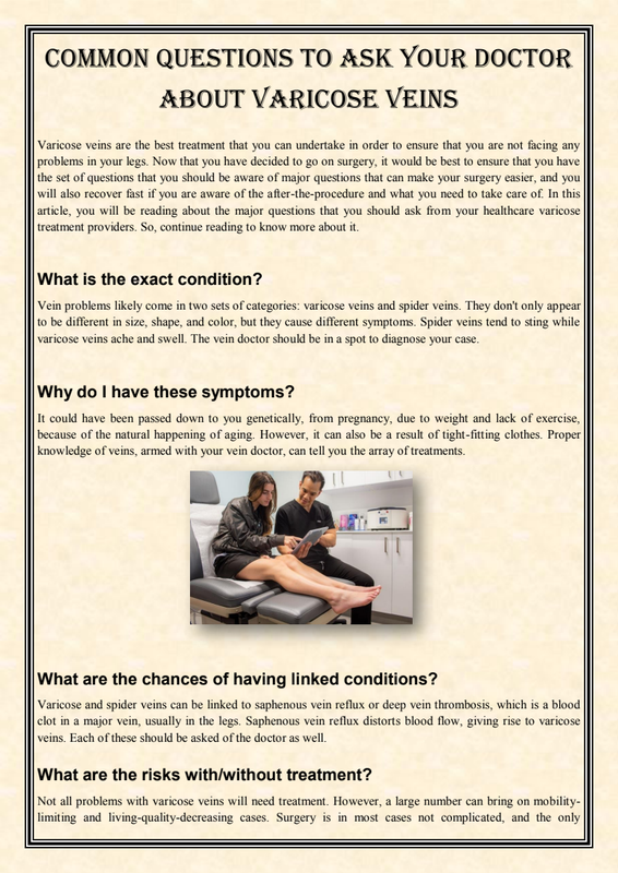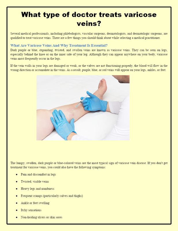So, your general doctor will probably refer you to a vein venter with a vein care specialist who will advise the treatment options if needed.Veins in your body play a significant role in the circulatory system as they're the blood vessels that carry the blood that's low in oxygen to the heart and lungs. What type of doctor treats varicose veins? A Vascular doctor can treat your veins diseases that include: